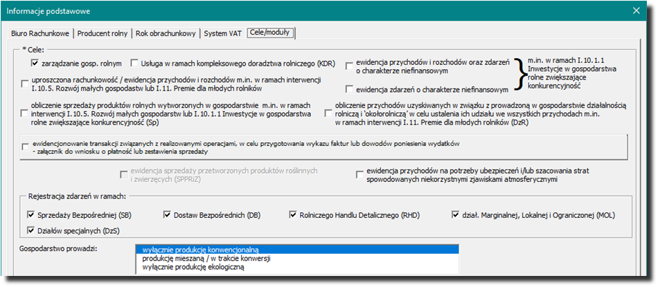 Od 2022 roku Narzędzie było dostosowywane do wybranych wytycznych opracowanych w ramach PS WPR 2023-2027 tak aby beneficjenci PS mogli wywiązać się z obowiązków prowadzenia 'rachunkowości rolnej' oraz przygotowania zestawień przychodów, sprzedaży, czy też wykazu faktur. Uproszczona rachunkowość - lepsze zarządzanie gospodarstwem - materiały informacyjne MRiRW. Podstawowe funkcjonalności:Możliwość dostosowania zakresu rejestrowanych danych do potrzeb rolnika (arkusz ‘Informacje_podstawowe’ -> wstążka ‘Narzędzie OE GR’ -> przycisk ‘Modyfkuj’ -> zakładka ‘Cele’. W zależności od potrzeb należy w odpowiednich polach zaznaczyć ‘ü’ preferencje. W efekcie, po kliknięciu w przycisk ‘Ok’, skoroszyt dostosuje zakres rejestrowanych danych ukrywając bądź odkrywając właściwe wiersze, kolumny i arkusze.