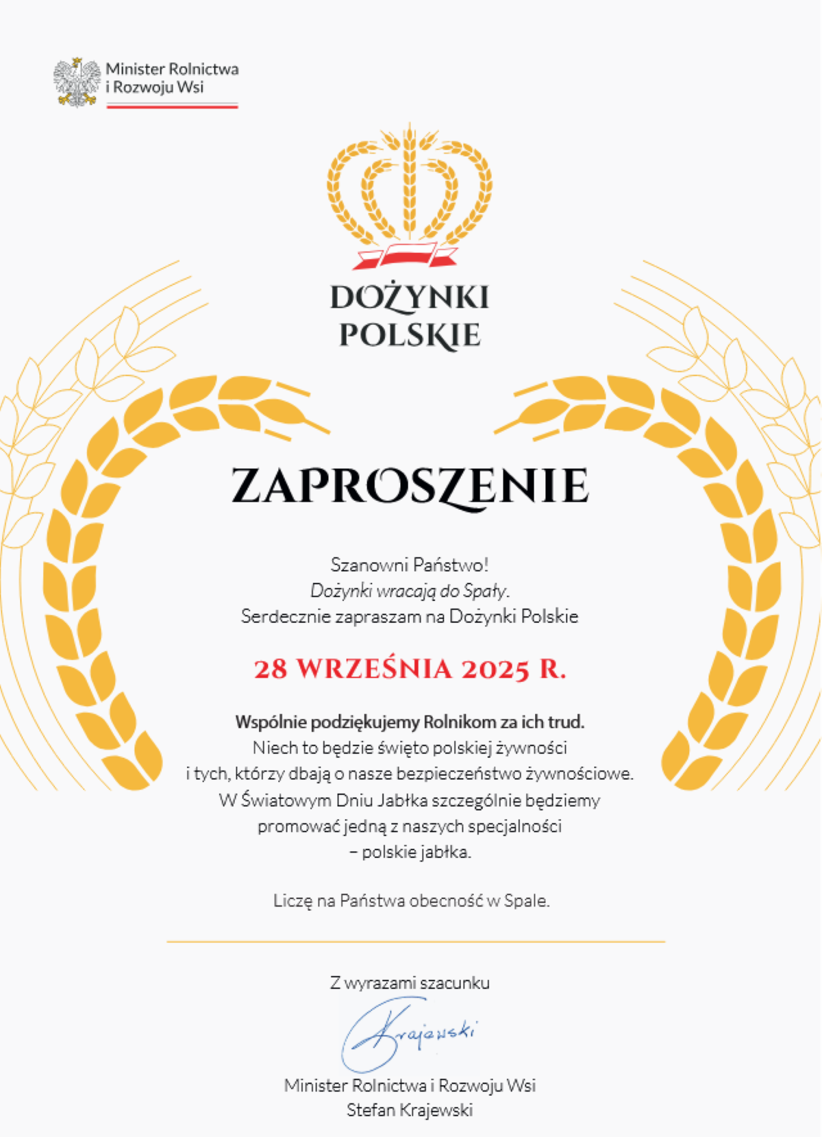 Już wkrótce Spała będzie centrum ogólnopolskich uroczystości dożynkowych. W programie przewidziano Mszę Świętą Polową, korowód wieńców dożynkowych oraz oficjalny ceremoniał z udziałem przedstawicieli władz państwowych. Uczestnicy będą mogli zobaczyć występy zespołów ludowych, koncerty artystów, a także zapoznać się z prezentacjami kultury ludowej z różnych regionów kraju.